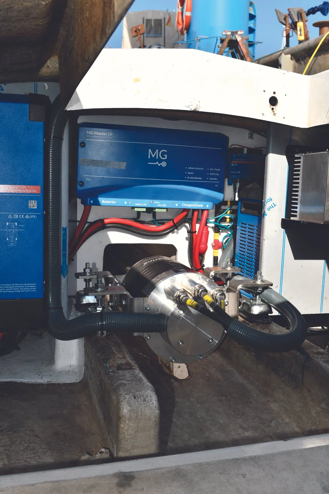 We replaced a 6 hp Solé Diesel engine with a 5 kW Bellmarine inboard electric motor (equivalent to 10 hp diesel).